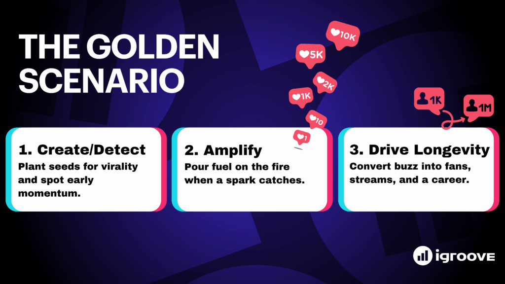 Now let’s break down the Three-Step Golden Scenario in action. Each stage of the cycle plays a distinct role: first you spark attention or detect UGC-driven momentum, then you scale it, and finally you turn that momentum into lasting growth. Mastering these steps—and knowing when to move from one to the next—this is what separates artists with fleeting moments of virality from those who master a repeatable engine for success.